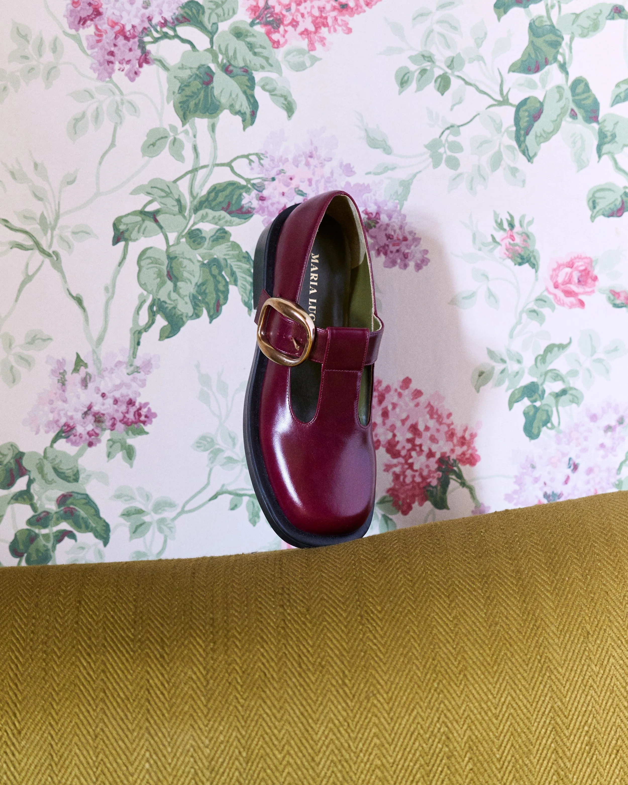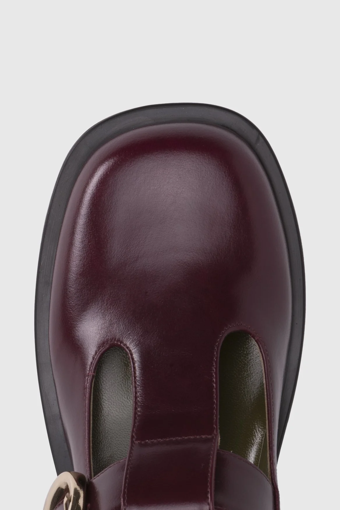 Crafted from glossy nappa leather with a rich, polished finish, the Nora Mary Jane in Bordeaux has a classic silhouette reimagined with a bold, slightly chunky sole and an oversized gold buckle. The T-bar cut adds a retro-inspired charm, making it a versatile staple for everyday sophistication.