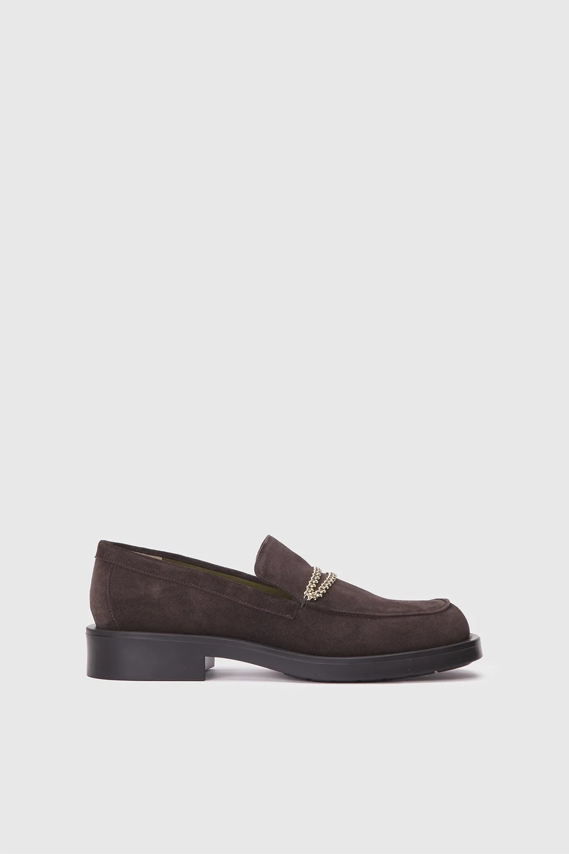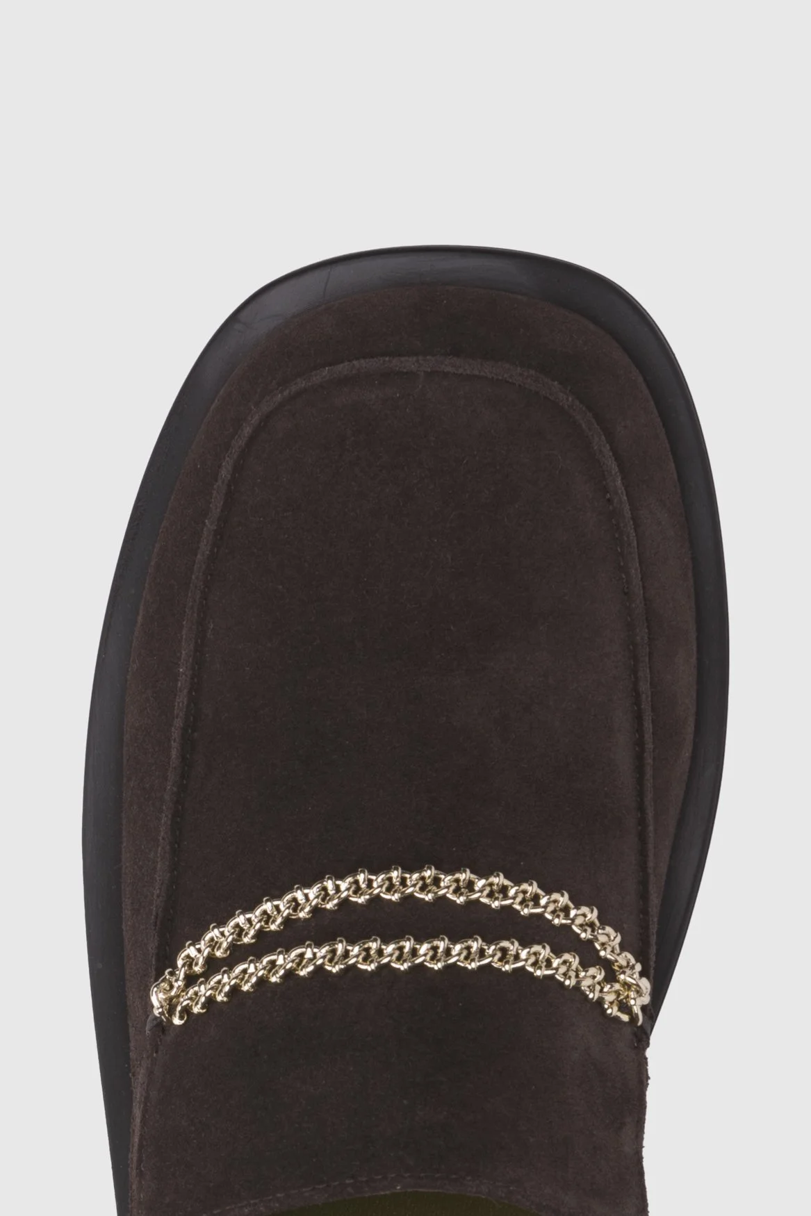 Crafted from rich chocolate suede, the Noemi loafer features a soft square toe and double gold chain detail for a refined take on a relaxed silhouette. A lightweight rubber sole ensures all-day comfort and easy urban wear.